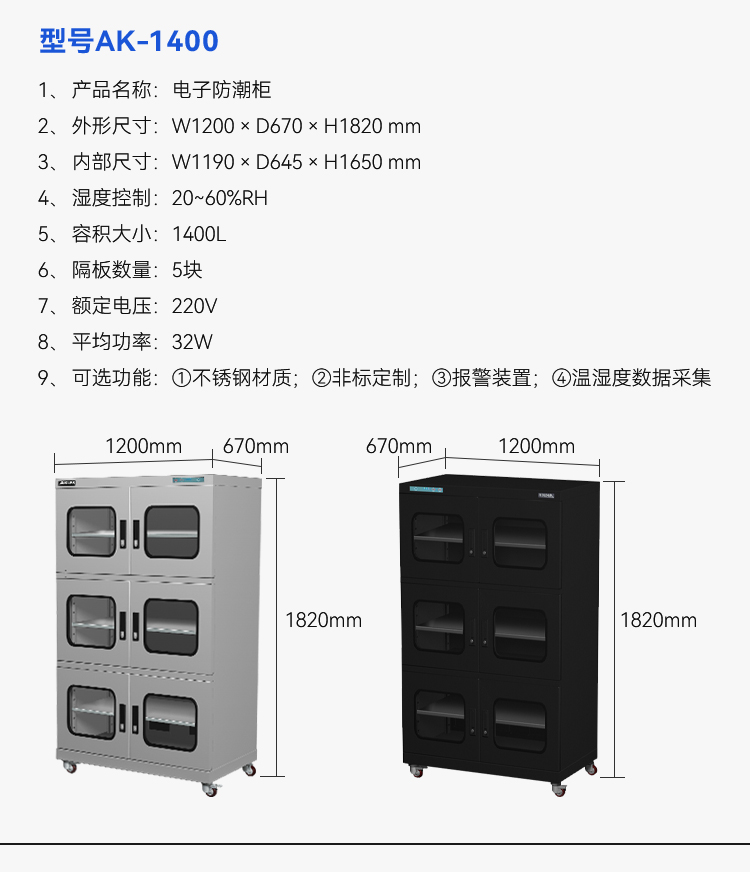产品容量:900L,外尺寸:900*600*1910mm,层板:5块,湿度范围:20-60%RH