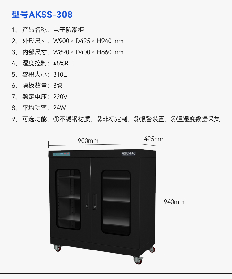 产品容量:490L,外尺寸:600*670*1374mm,层板:3块,湿度范围:≤5%RH