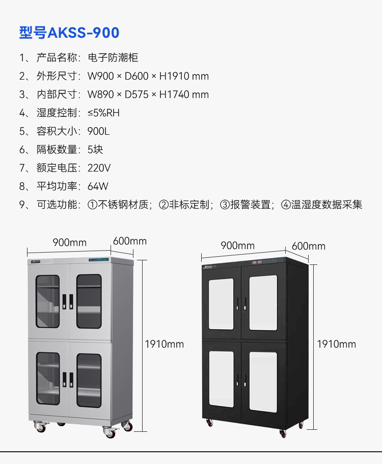 产品容量:900L,外尺寸:900*600*1910mm,层板:5块,湿度范围:≤5%RH
