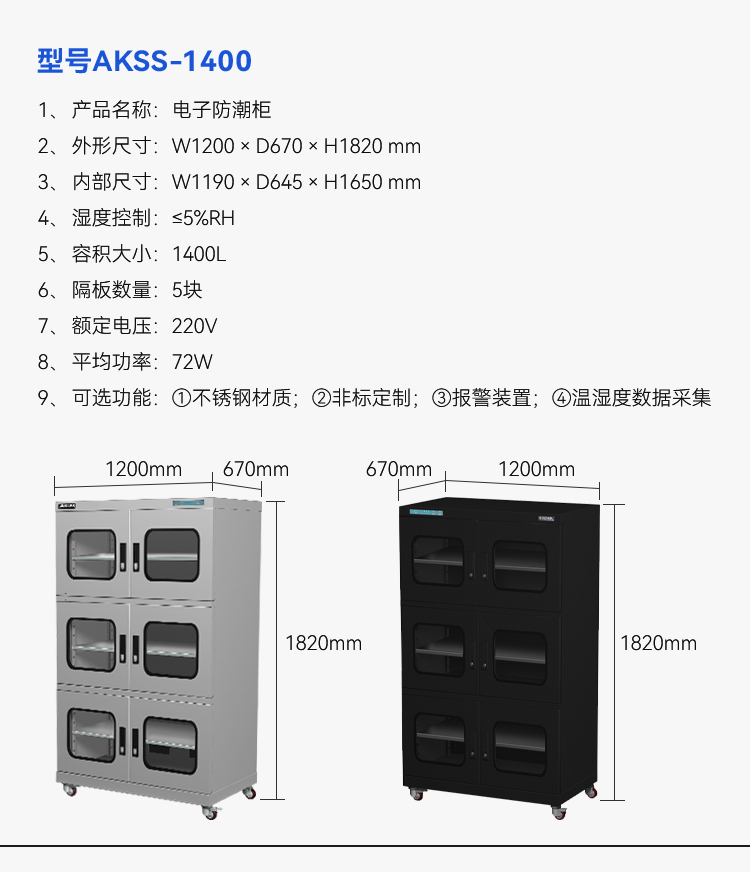 产品容量:760L,外尺寸:600*670*1910mm,层板:5块,湿度范围:≤5%RH
