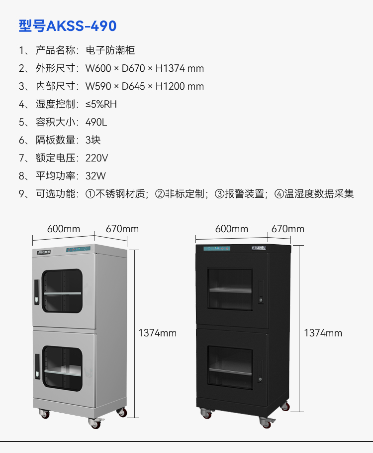 产品容量:490L,外尺寸:600*670*1374mm,层板:3块,湿度范围:≤5%RH